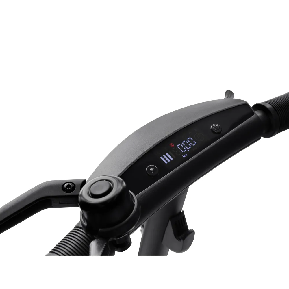 Самокат снабжён бортовым компьютером, на дисплее которого отображается информация о выбранном режиме езды, пройденном расстоянии, скорости, уровне заряда аккумулятора и режиме работы ходовых огней.