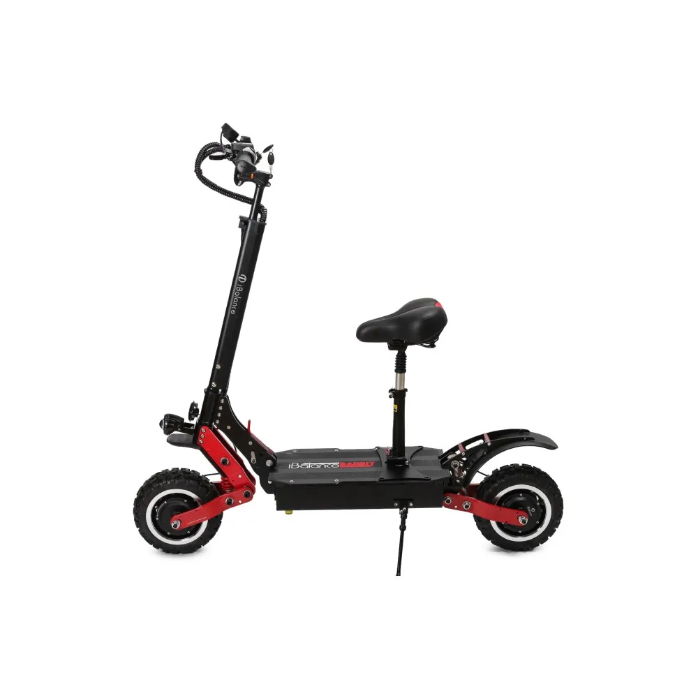 Электросамокат iBalance Bandit мощный полноприводный агрегат, который подойдет для передвижения по любому бездорожью. Прочная массивная конструкция вызывает доверие, максимальная нагрузка на устройство 150 кг. С усиленной амортизацией передних и задних колес электросамокат имеет плавный ход даже по гравийной дороге. Колеса диаметром 11 дюймов, с протекторными внедорожными шинами. В комплекте идут запасные шоссейные шины.