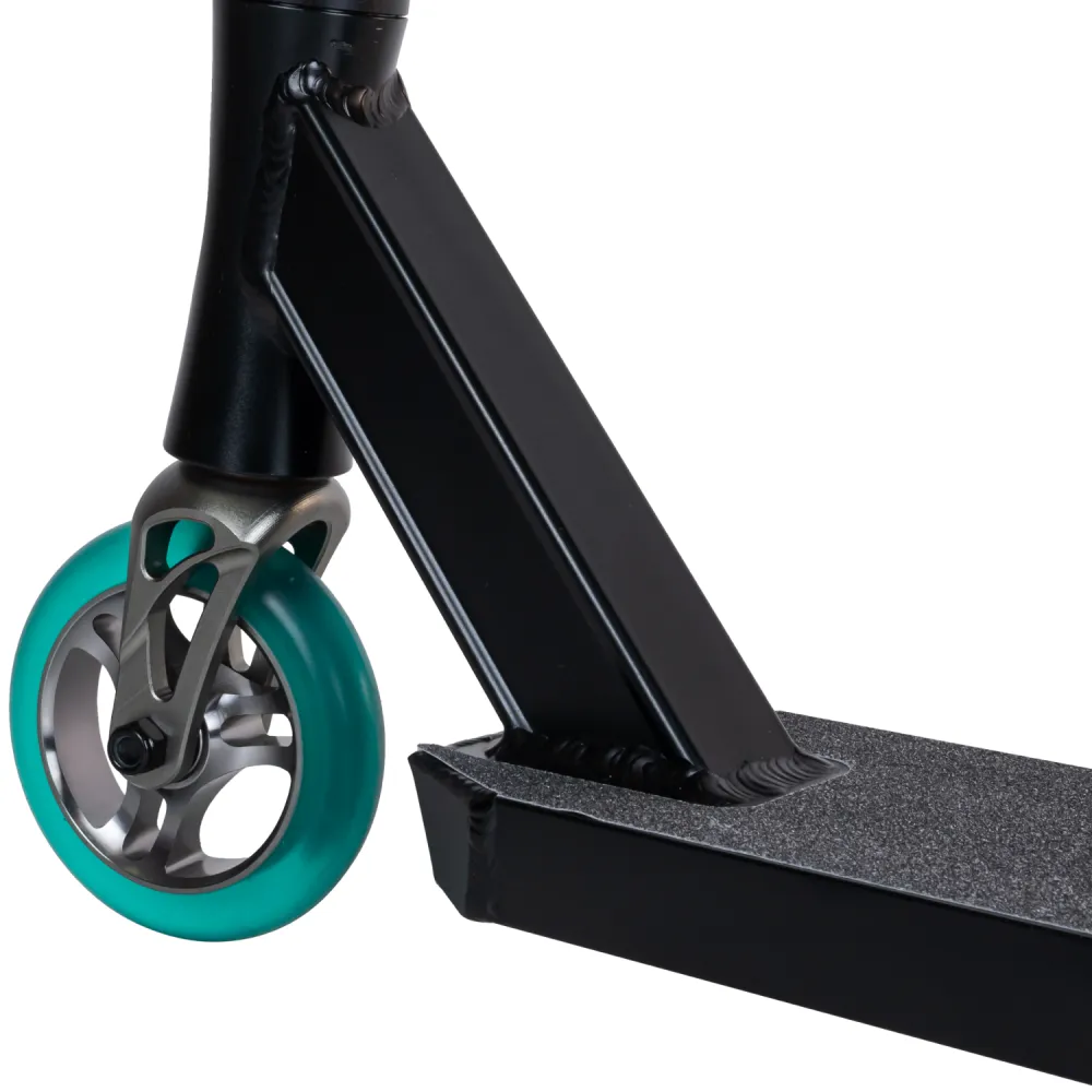 110-мм колесная часть изготовлена из долговечного, мало стираемого полиуретана. Наличие алюминиевой фрезерованной вилки и фирменного заднего тормоза райдер может рассчитывать на качественный безопасный отскок.